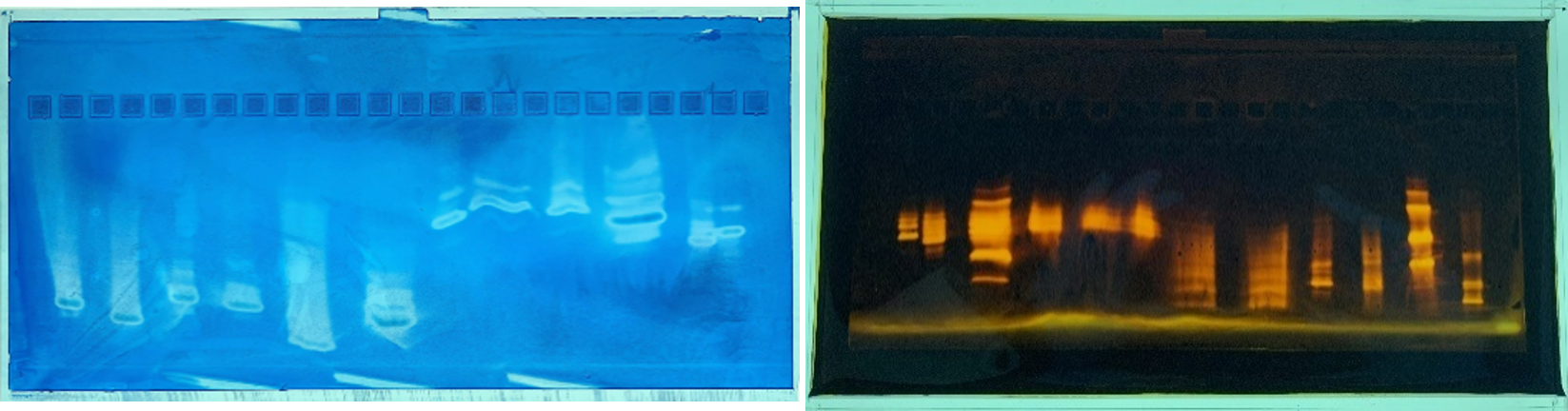Mit dem modernen BlueHorizon®-Isoelektrischen Fokussierungssystem identifizieren wir Enzyme effizienter als mit herkömmlichen Methoden. Nach gezielter Probenvorbereitung trennen wir die Enzyme im Gel nach ihren physikochemischen Eigenschaften und machen sie durch Färbung sichtbar. Der Vergleich mit Referenzen und unserer internen Datenbank ermöglicht eine eindeutige Identifikation.